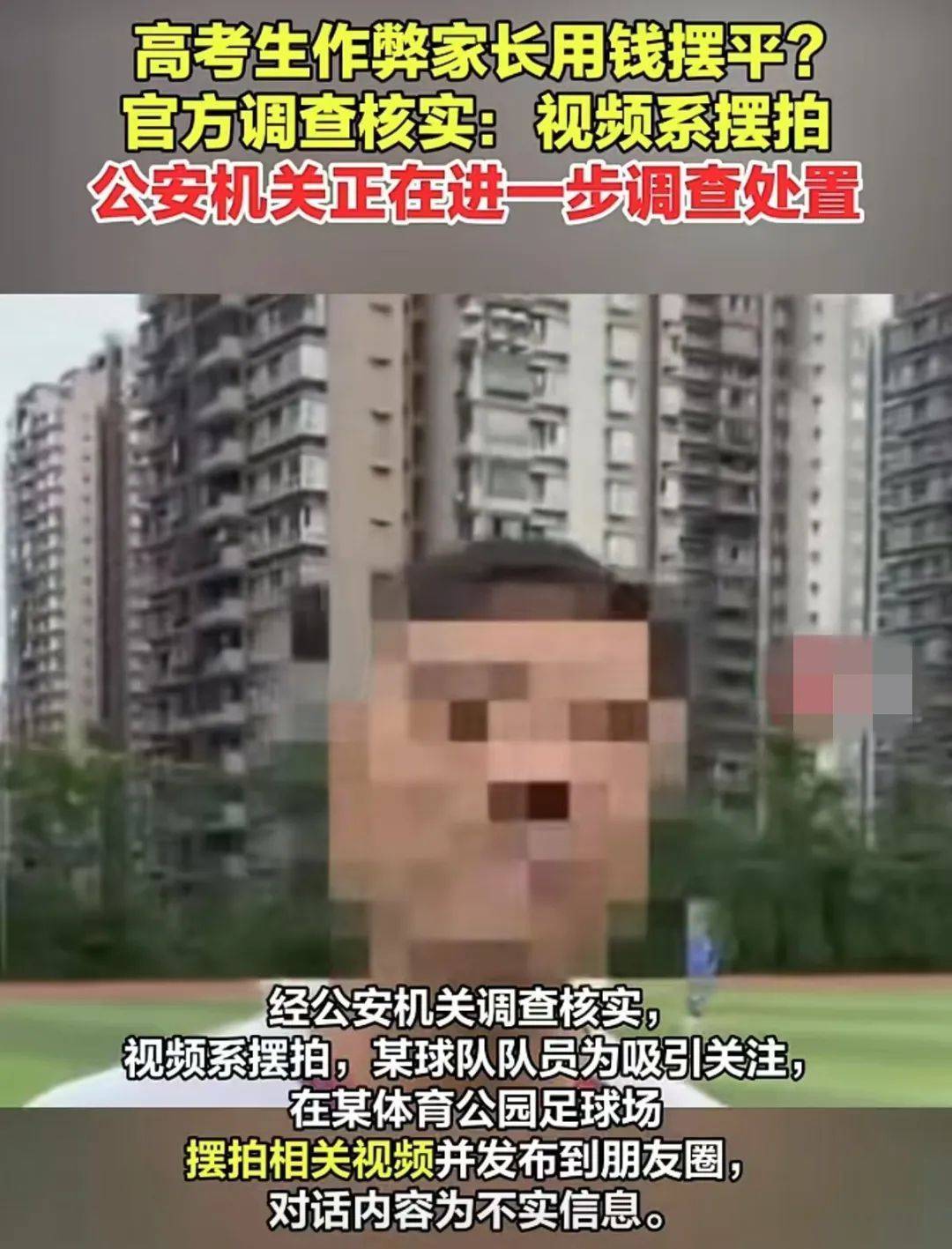 据重庆市南岸区网信办微信公众号“网信南岸”消息,6月8日,网络上传播一则视频,视频中拍摄者问“昨天娃儿高考作弊遭发现了,现在是什么心情”,一穿着某民间足球队队服的“家长”回应“花点儿钱把事情了了,具体就不方便透露了”。经公安机关调查核实,视频系摆拍,目前,该朋友圈视频已删除,公安机关正在进一步调查处置。